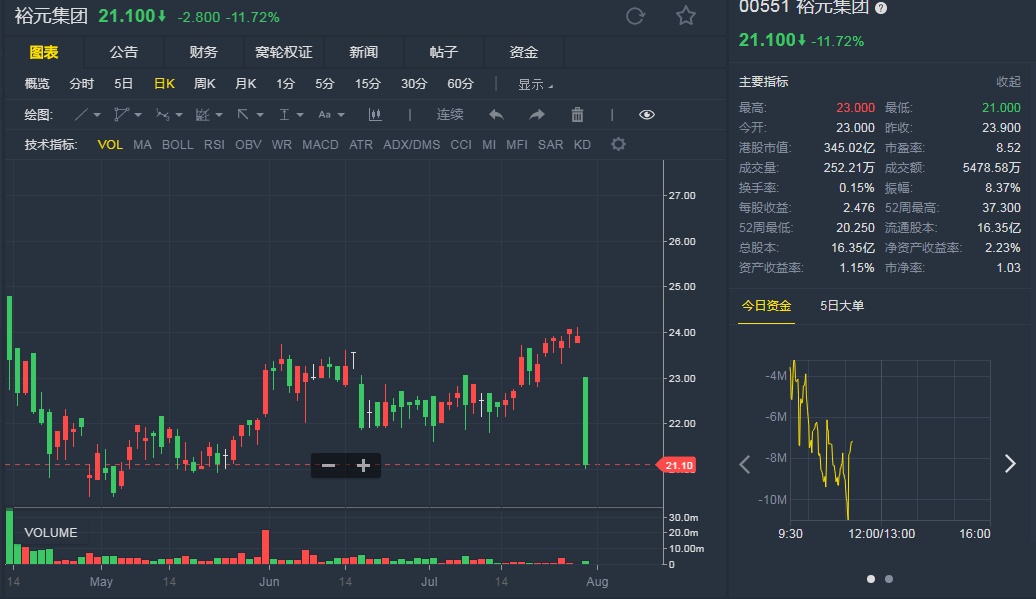 截至7月30日,裕元跌11.72%,报21.1港元。