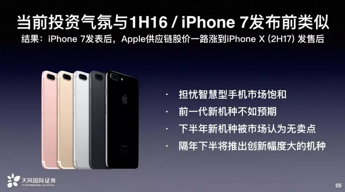 刚讲了2018下半年,我们回到2016上半年,如果各位看电子业的有记忆,2016年上半年在发表iPhone7前,市场都知道iPhone7不会有什么太多的变化。也因为iPhone6太成功,所以刚经历iPhone6s订单下修,而大家对iPhone7觉得没有什么新功能,因此整体预期气氛是非常低的。但是后来历史告诉我们股价和市场是背道而驰的。