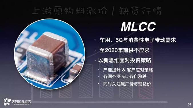 我挑选最被大家都关注的MLCC,简单来说,是车用、5G与消费性电子带动需求,在2020年之前这个产业是供不应求的。可是我们认为现在开始有些不一样了,投资气氛开始不同了,特别台湾方面,相关供应链股价开始修正不是没有道理的,为什么?因为有一些事情正在改变。到2020之前其实供不应求,这个都没有问题。可是有些事情开始改变了,我认为会影响投资人的情绪甚至会影响公司未来成长性。