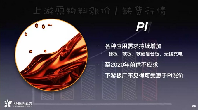 再来就是PI。主要还是在于各种应用需求的持续增加,包括硬板、软板、软硬复合板和无线充电。特别是软板的部分,因为每一年智慧型手机的新功能不断地增加,所以软板的条数不断地增加。软硬复合板,特别是像电池的软硬复合板面积变大的趋势也是很明显的,因为智能型手机要求越来越大电池容量,所以复合板的面积变大,因此PI用量就会变多。还有无线充电,我们认为Apple发售AirPower之后,对于整个产业的生态应该会有一个更正向的帮助,带动更多无线充电的机种或配件发布,这也会影响到上游的PI的需求。这个东西跟MLCC一样,我们认为到2020年前其实是供不应求的,主要还是在于厂商扩产不及以应付新需求。据我们的理解,现在最大的供应商杜邦,他们目前并没有打算扩产的需求,排名后面的供应商虽然有扩产,但是依然没有办法满足我们刚才提到应用需求上的增量。我们认为在这故事上,投资上游还是比较好的,包括像我刚刚提到的杜邦或者日本的UBE,或是台湾的达迈。下游板厂不见得可受惠于PI涨价,因为能不能涨价并不是只看材料售价,而是看产业结构。如果板厂供应商比较多,自然涨价趋势比较难。
