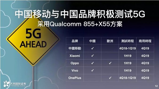 再来就是5G的部分,5G最大技术改变有两个:一个就是低延迟,再一个就是高频宽,低延迟、高频宽对于5G的推动会非常有利,特别是像是AR或者是车用电子等等,未来在迈向AR时代的时候,一定有一个过渡,就是AR穿戴需要和手机搭配,这时候手机若是具备低延迟传输,就可以提供AR更好的体验。中国业者积极参与测试,手机端采用Qualcomm 855+X55的方案,这里面我们简单列出来中国移动还有其他中国手机品牌在中国有与欧洲有没有测试计划与商用化时程,不过我们认为这个计划肯定会变,因为我们现在看到有一些计划已经延迟了,所以到最后会往后推迟一个季度或者两个季度,不过我们觉得无所谓,这个不影响整个大趋势的发生。