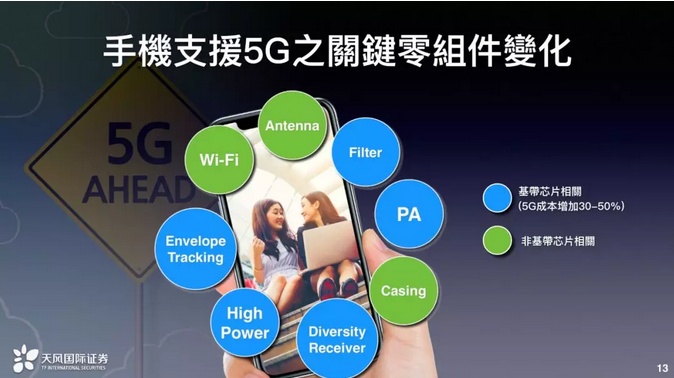 蓝色是跟基频相关的,单价几乎都会提升,另外就是看到数量上的增长,比如要支援5G的手机,而且要4G有向下相容性的话,PA要一颗到两颗,这些都是投资市场要关注的事。如果支援5G,而且上下相容4G的话,大概会让手机基频芯片的成本增加30-50%,所以为什么苹果逐渐地要把许多芯片自制化,因为节省成本,因为其中的考量是已经看到这些改变都会让它成本增加,可是它不能提高售价的情况之下只好去降低成本。