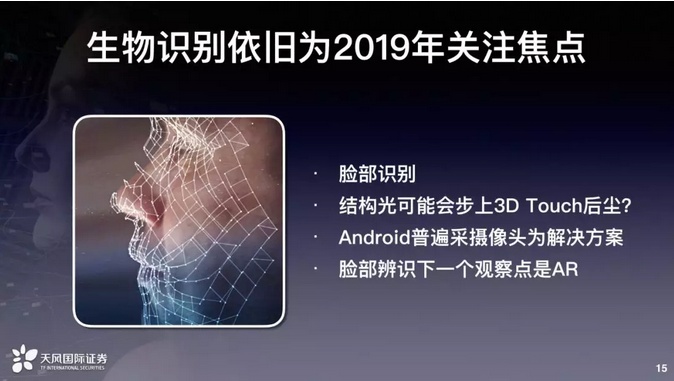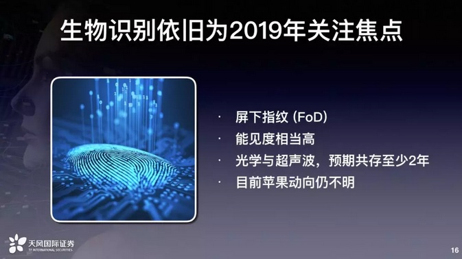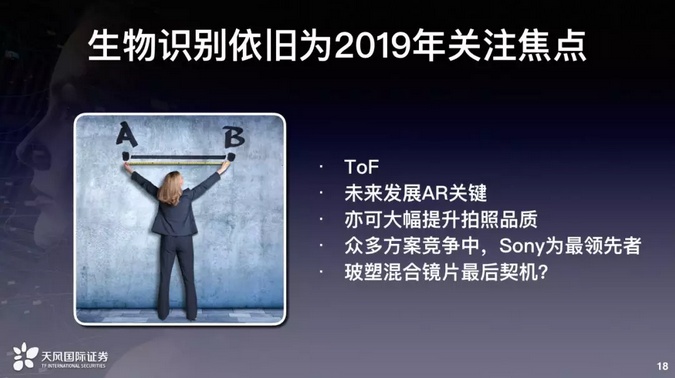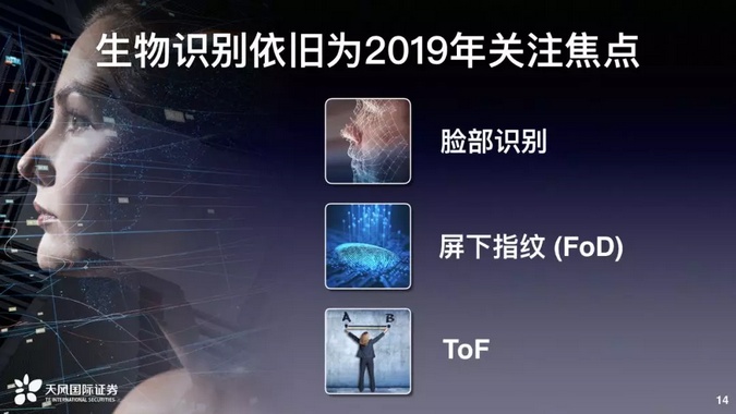 最后我们看生物识别。这是明年非常重要的一个关注焦点,生物识别来讲包含着三个大主题,就是脸部识别、屏下指纹还有ToF。ToF是一个测距的距离,不见得做生物识别,有可能识别非生物。