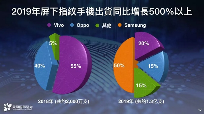 屏下指纹是一个能见度非常好的一个行业,很多厂商的出货预估或是未来技术升级路线非常明确,2019年屏下指纹手机出货可能会同比增长500%以上,如果这个写成标题应该是蛮吓人的。主要还是今年下半年,Oppo跟Vivo、华为小米等等推出屏下指纹的机种,整年度加起来大概差不多1800万支到2000万支,Vivo是目前最领先的,采用汇顶的芯片与丘钛的模组的模组。如果OPPO和VIVO低端新机型会支持屏下指纹,如果会的话,最乐观的预估今年屏下指纹机种搞不好超过2500万支到3000万支了,这个数字应该超乎现在很多投资人的想像。