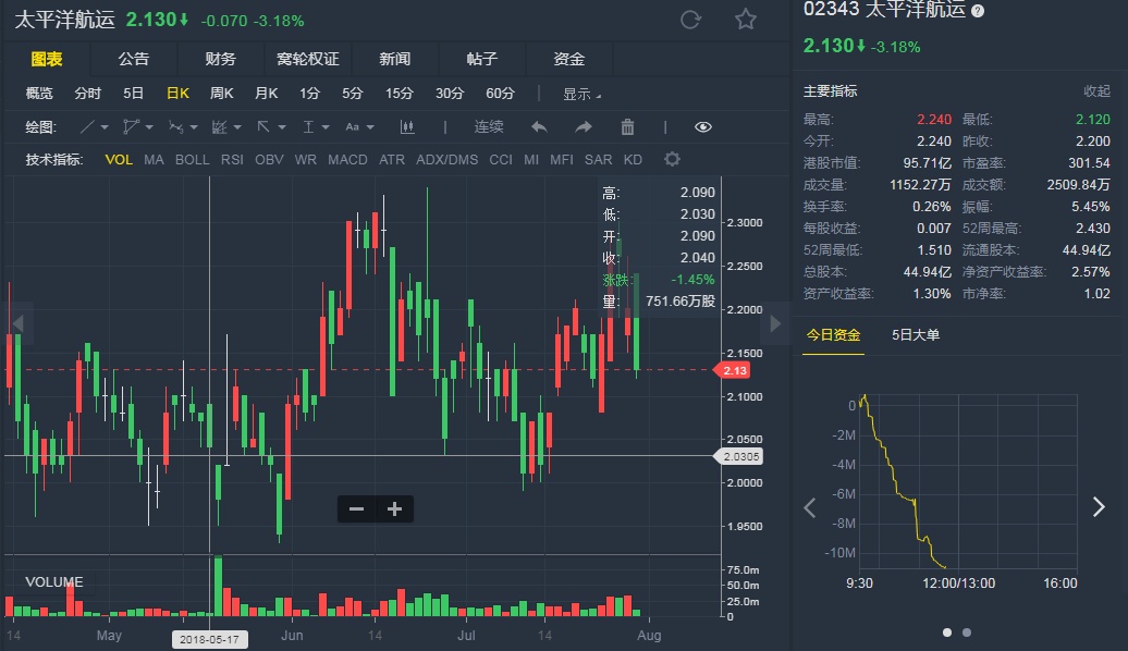 截至7月30日,太平洋航运跌3.18%,报2.13港元。