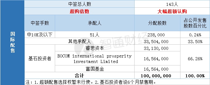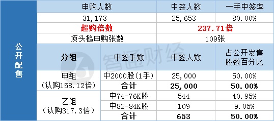 其中,公开配售申购人数31173,一手中签率80%,超购倍数237.71倍。