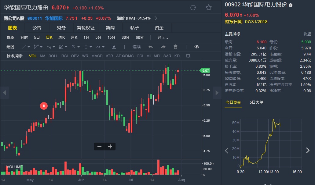截至7月30日,华能国际涨3.07%,报6.07港元。