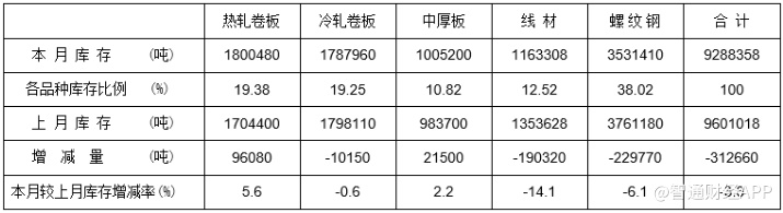 螺纹钢本月库存353万吨,比上月减少23万吨,下降6.1%。其中钢材市场库存342万吨,比上月减少24万吨,港口库存12万吨,比上月增加1.1万吨。