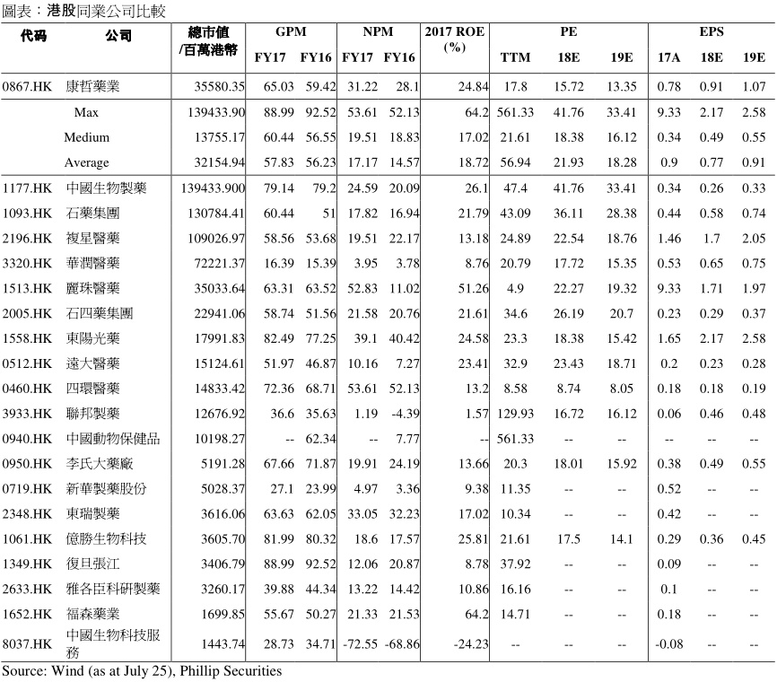 近期市场波动,公司股价受影响。除市场因素外,我们判断4月份在研产品Traumakine专案揭盲效果不理想,可能是市场对其忧虑之一,但我们认为这并不影响公司现有产品组合的持续增长,以及引入新产品带来的增长动能。我们维持2018/2019年每股盈利预测0.77/0.86元,目标21港元,建议逢低买入。(现价截至7月26日)