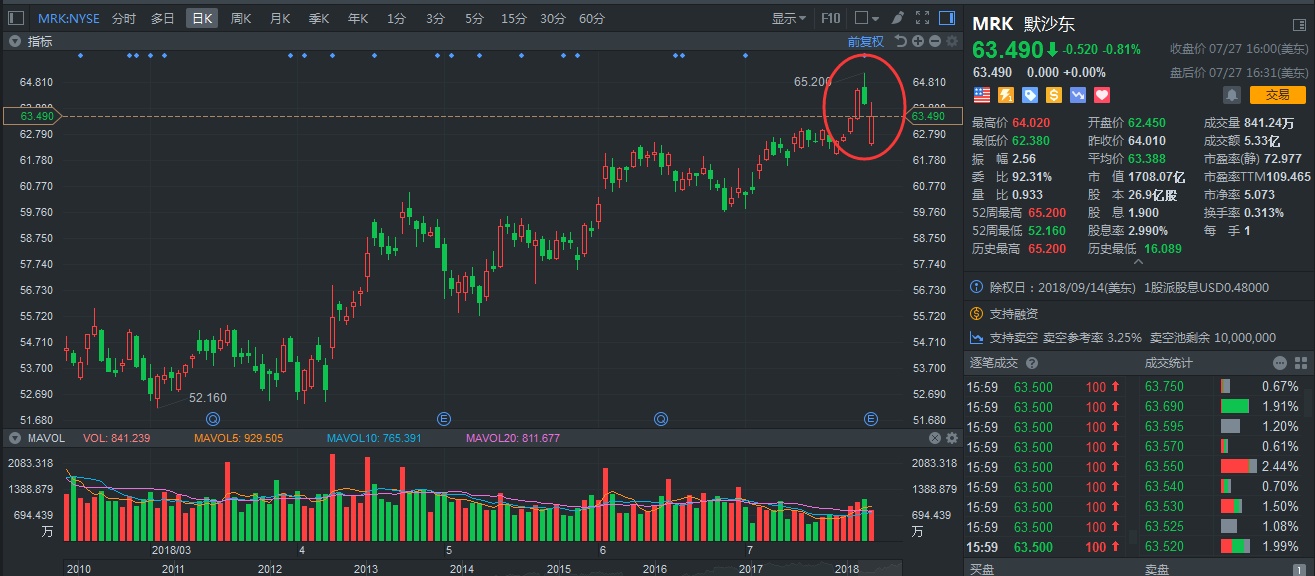 受利好影响,Keytruda所有者默沙东在纳斯达克进一步走高。智通财经APP观察到,美东7月26日,该股创下历史最高价65.2美元,市值突破1750亿元,继续稳座美股医药头三甲。