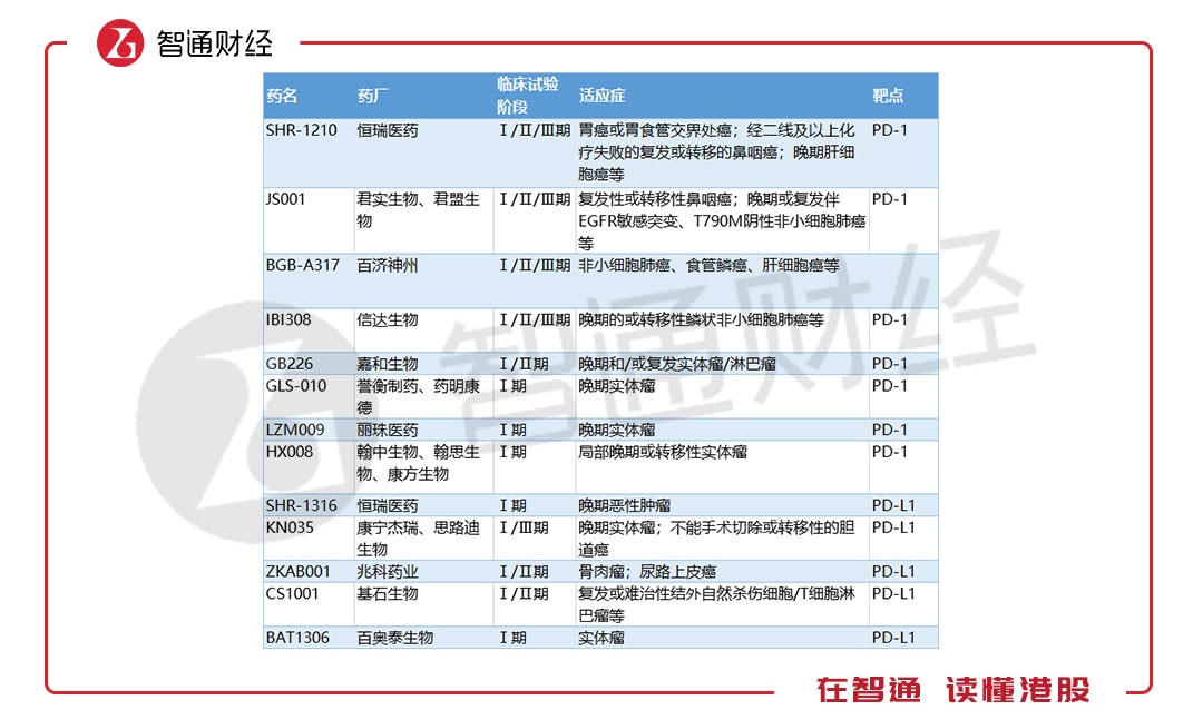 智通财经APP看到的数据显示,目前国内共有30余家企业参与PD-1/PD-L1领域的竞争,其中4家已经提交上市申请(包含1家撤回申请)、18家正在进行临床、9家申报临床后等待批准。如百济神州、恒瑞、信达生物、药明康德、丽珠医药……