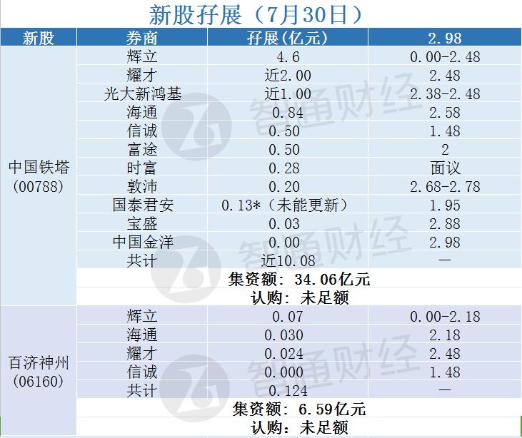 截至7月30日,正在招股的新股中,耀才、辉立等11家券商为中国铁塔(00788)借出孖展金10.08亿港元,认购未足额。辉立、海通、耀才、信诚4家券商为百济神州(06160)借出孖展金0.124亿港元,认购未足额。具体情况如下: