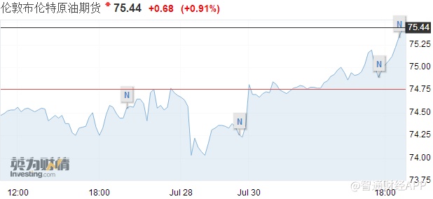 布油日内涨幅近1%,截至发稿,报价75.44美元,涨0.68或0.91%。