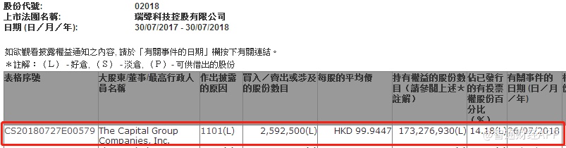 另外,The Capital Group于同日还增持瑞声科技(02018)259万股,每股作价99.9447元,总值2.59亿元,最新持股量增至14.18%。