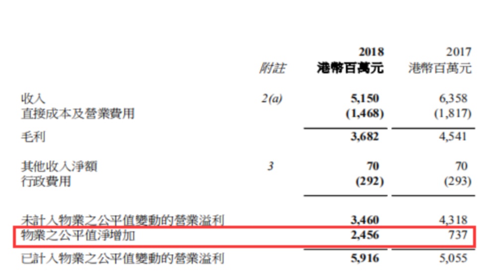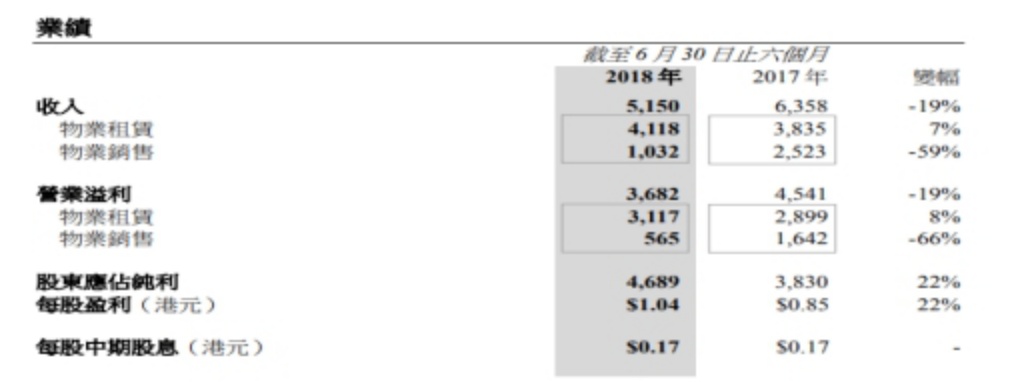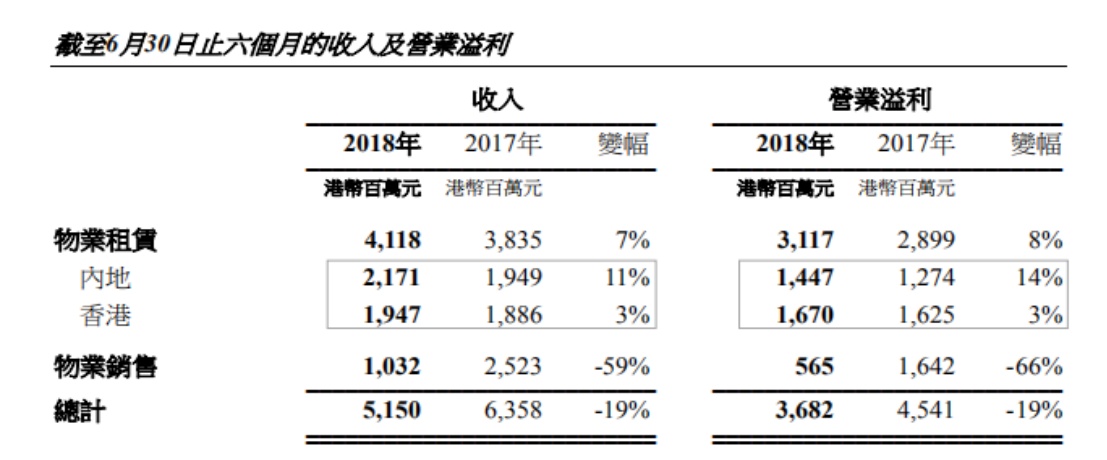 公司2018年上半年取得整体重估收益港币24.56亿元,较2017年底的估值增加2%。香港和内地的物业组合分别录得重估收益港币22.16亿元及港币2.40亿元。