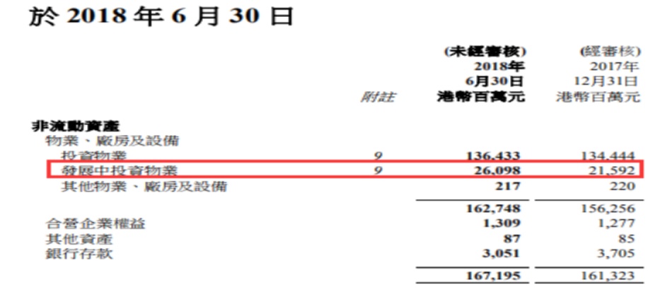 恒隆资产负债表显示,公司发展中物业在今年中期达到26.98亿元,同比增长约17%。