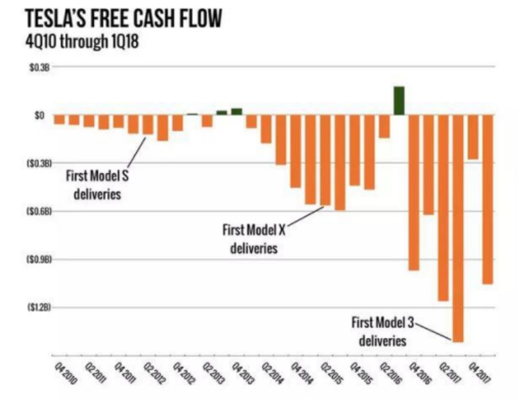 彭博数据显示,截至上季,特斯拉的自由现金流已连续5个季度出现负增长,从2016年底到2017年底的12个月周期内,特斯拉每季度的负自由现金流量至少有5亿美元。目前,特斯拉总负债金额超过 100 亿美元,其中未来 8 个月就需要偿还 10 多亿美元。有鉴于此,特斯拉已经采取一系列措施(包括裁员9%以减少支出成本、向加拿大等地区开放订单等)来改善其财务状况。