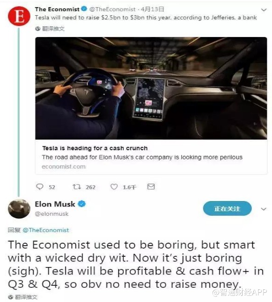 不过,4 月 13 号,马斯克在 Twitter 上表示,特斯拉会在 2018 第三季度与第四季度实现正的现金流与利润,届时将不需要再筹资。