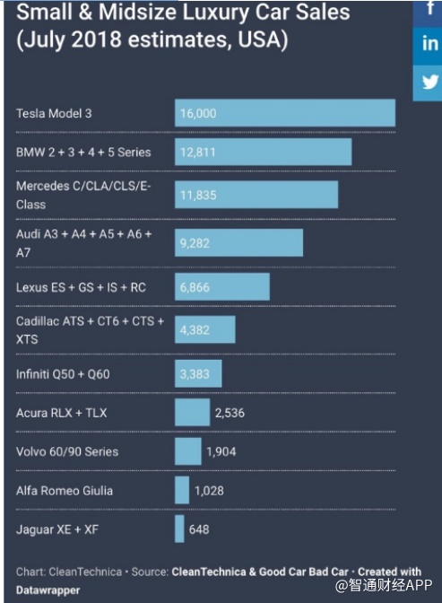 特斯拉“铁粉”们对Model3的产量很有信心。最新的7月美国汽车销统计,单单是一款特斯拉Model 3的销售,已超过了很多中小型豪华进口和国产车辆(也包括传统汽车)。