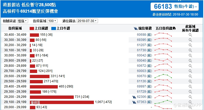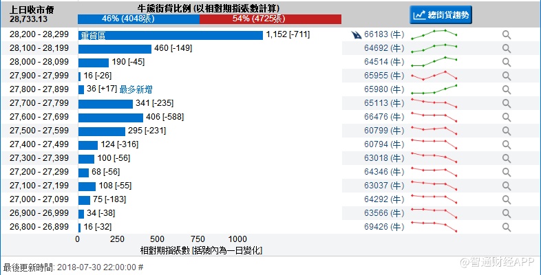 智通财经APP获悉,截至7月31日,恒指最新的牛熊街货比例为46:54。从瑞信恒指牛熊证街货分布图中得到的数据显示,熊证街货重货区在29100-29199区间,此区间最新的熊证数量为1067张,比上一交易日减少472张。牛证中重货区在28200-28299区间,该区间最新牛证数量为1152张,比上一交易日减少711张,最多新增落在27800-27899区间。