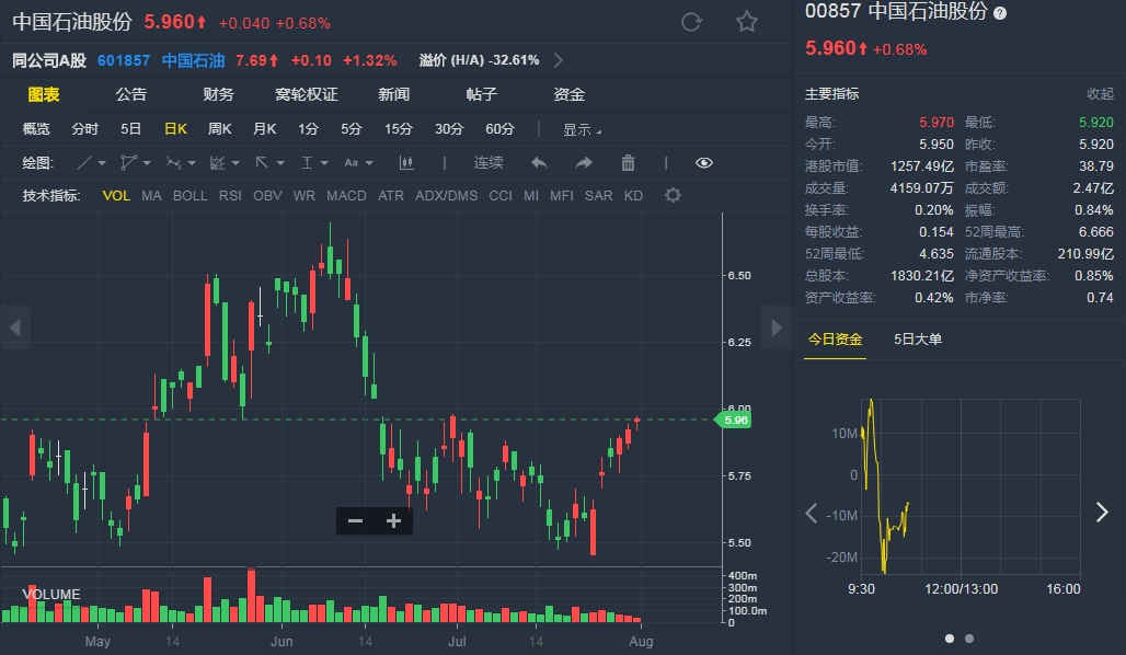 截至7月31日,中石油涨1.32%,报5.96港元。