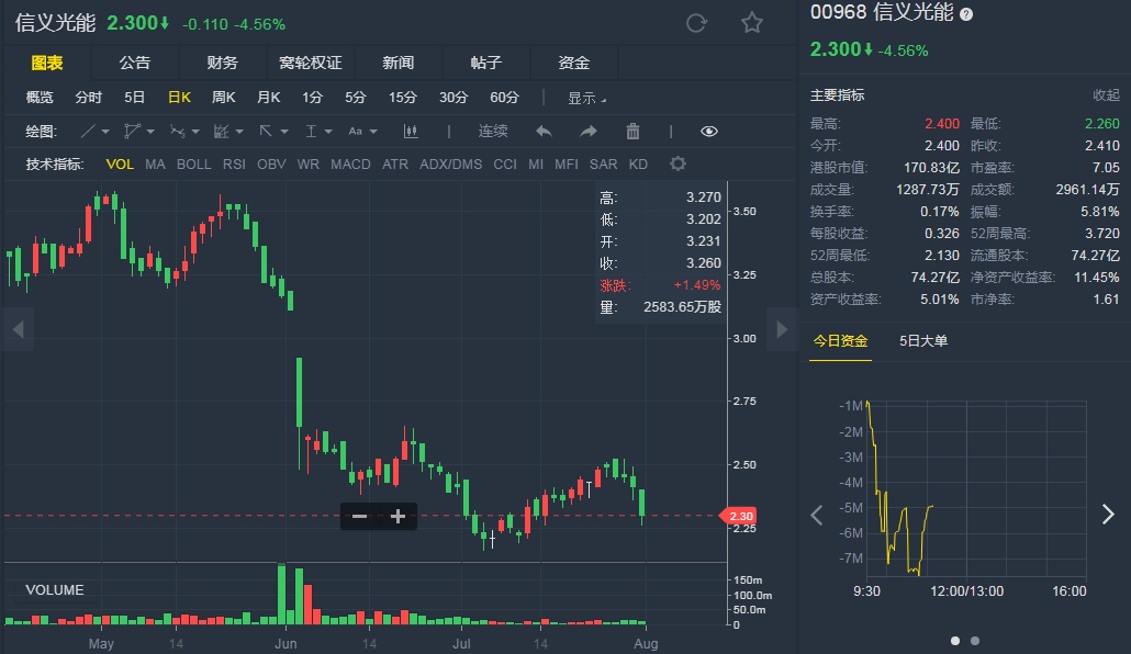 截至7月31日,信义光能跌4.56%,报2.3港元。