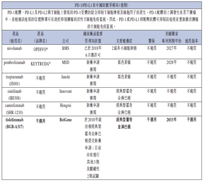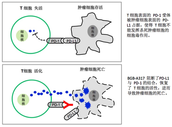Tislelizumab,一款在研针对免疫检查点受体(PD-1)的单克隆抗体,它能够与T细胞表面阻碍免疫激活的重要受体PD-1结合,抑制PD-1,并清除癌细胞激活免疫系统的阻碍因素,从而恢复T细胞的肿瘤杀伤能力。截止2018年7月5日,临床试验已超过1500名患者,数据表明,Tislelizumab具有良好的耐受且表现出抗肿瘤活性。根据国家药品监督管理新药上市申请前会议,公司有望2018年在中国提交治疗霍奇金淋巴瘤的首次新药上市申请。