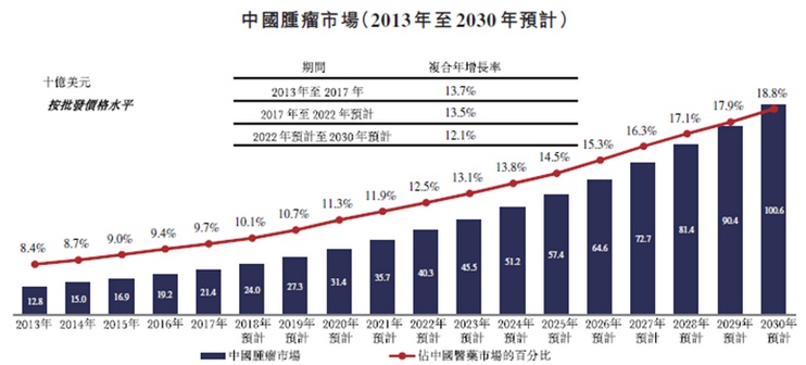 中国抗肿瘤药物市场近年增长快速,从2013-2017年,市场年复合增长率达13.7%,预计2030年市场将达到1006亿美元。