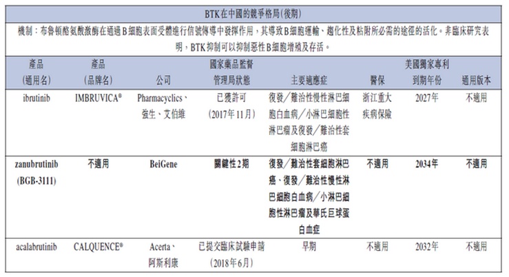 公司核心在研药物,Zanubrutinib所涉及的BTK抑制剂2017年全球销售约为32亿美元,主要竞争对手为2017年已于中国获批上市的伊布替尼。