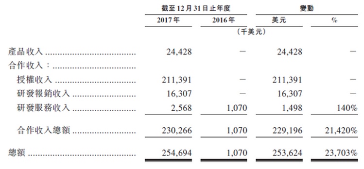 公司虽然没有上市产品,但是截止2017年底,公司90%的收入来自因与新基合作而获得的前期许可费、补偿研发费用和里程碑付款,9.6%来自中国产品分销,成功找到目前最优收入模式。