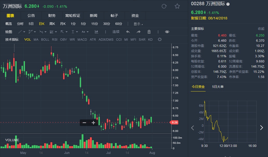 截至7月31日,万洲国际涨跌1.14%,报6.28港元。