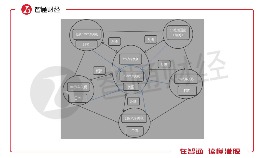 当美国处于2.5%的汽车关税时,各个国家关税政策不会变化,处于均衡状态。但美国单方面将汽车关税由2.5%上调10倍至25%,情况将发生巨大的变化。若美国实施25%的汽车关税,将比欧盟的高15%,比韩国和日本的高25%,比中国的高10%,上述国家或将采取相应的行动,维护贸易的均衡。