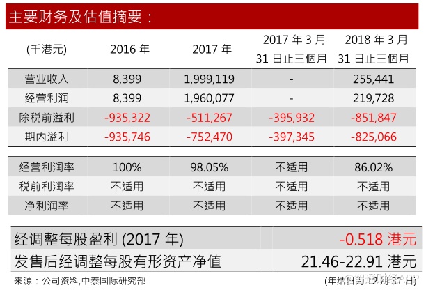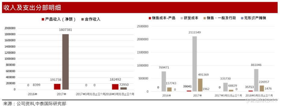 经营业绩方面,公司尚未形成稳定的收入现金流与盈利能力,从2017年9月起,公司才从旗下许可药物中获得产品收入。2016年、2017年及2018年前三个月营业收入分别为840万港币、20亿港币与2.55亿港币,分别亏损9.36亿港币、7.52亿港币和8.25亿港币。研发成本均占各期总成本的约80%。