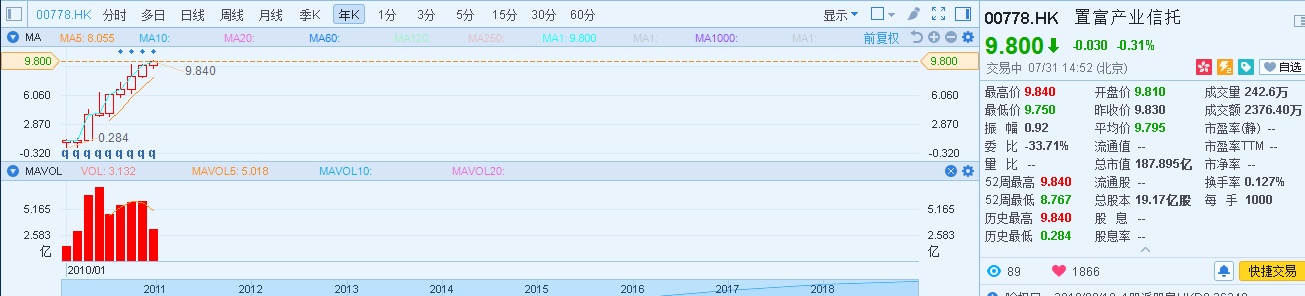 比如置富产业信托(00778),作为一只在新加坡及香港同时上市的REIT,上市八年以来,股价每年维持上涨,至今涨幅高达10倍,不仅远甩股市大盘好几条街,甚至跑赢直接投资深圳或香港房地产的收益。此外,领展房产基金(00823)、泓富产业信托(00808)、阳光房地产基金(00435)、越秀房地产信托基金(00405)也表现不俗。