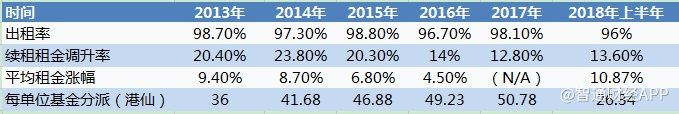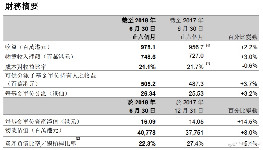 派息方面,可供分派收益达5.05亿港元,同比增长3.7%。期内每基金单位分派26.34港仙,同比增长3.2%。按2018年6月29日每基金单位收市价9.22港元计算,年度化分派收益率达到5.8%。