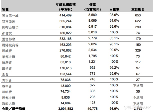 目前,置富产业信托持有16项位于香港的零售物业,包括累计面积约300万平方呎的零售楼面及2713个车位,如置富第一城、置富嘉湖、马鞍山广场、丽港城商场、丽城荟等都是置富产业信托旗下的物业。