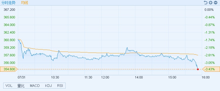 智通财经APP获悉,受美股科技股大跌影响,H股科技股板块普遍下挫,腾讯控股(00700)股价持续下跌,拖累恒指表现。截至15时52分,跌3.43%,报价354.6港元,成交额112.4亿。