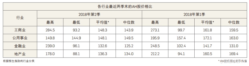智通财经APP获悉,恒生指数公司发布2018年第二季季刊。2018年二季度,恒生沪深港通AH股溢价指数(HSAHP)第二季收巿水平为118.1点,即AH公司的A股整体相对H股出现约18%的溢价。较上季度所有行业分类的AH价格比中位数下跌,反映整体的A股与H股的价格分歧出现收窄。