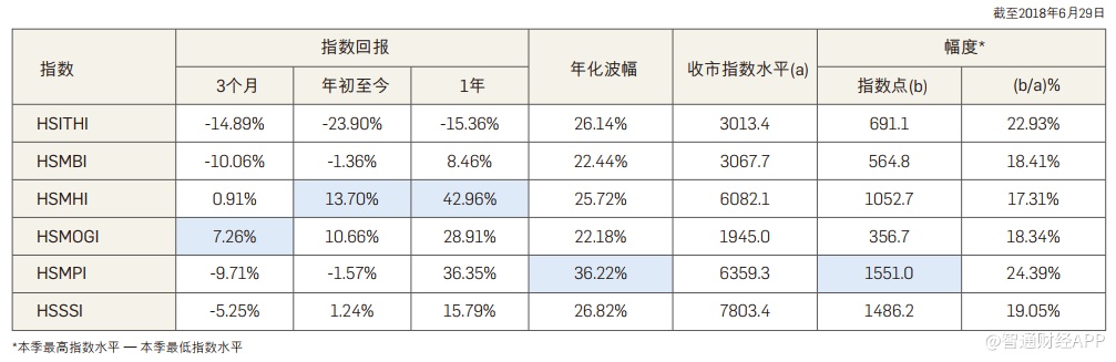 2018年二季度,恒生中国内地石油及天然气指数(HSMOGI)以7.26%的回报成为本季系列中表现最优秀的指数。恒生中国内地地产指数(HSMPI)的年化波幅最高,达36%。恒生中国内地地产指数(HSMPI)本季度的指数幅度最大,近1551点。