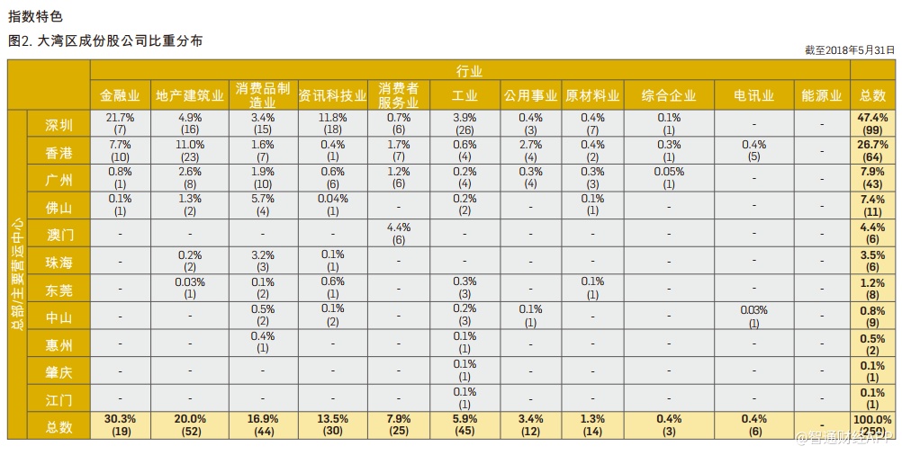 自2015年以来,恒生沪深港通大湾区综合指数的整体表现已有49%的增长,更胜香港和内地股市的旗舰指数,反映大湾区在分析期间有稳健增长。截至2018年5月底,恒生沪深港通大湾区综合指数250间成份股公司的总市值达到16万亿元人民币。超过75%成份股的市值介于50亿元人民币至500亿元人民币之间,仅5间成份股公司市值少于50亿元人民币。