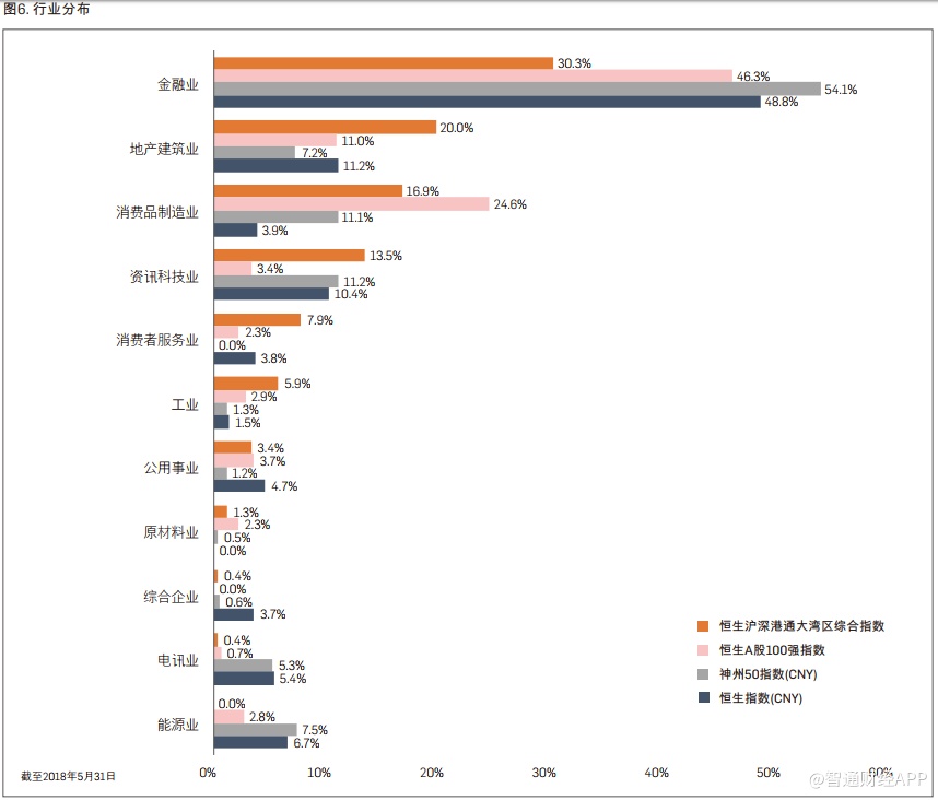 按行业分布比较,金融业、地产建筑业、消费品制造业和资讯科技业占恒生沪深港通大湾区综合指数的大部分比重,分别为30.3%、20.0%、 16.9%和 13.5%。相比恒生A股100强等其他指数,恒生沪深港通大湾区综合指数的行业分布更加多元化。例如,恒生沪深港通大湾区综合指数中的金融业比重较恒生指数的金融业比重低约18个百分点。