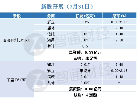 截至7月31日,正在招股的新股中,耀才、辉立、海通、信诚4家券商为百济神州(06160)借出孖展金0.5亿港元,认购未足额。辉立、耀才、信诚3家券商为千盛(08475)借出孖展金0.027亿港元,认购未足额。具体情况如下: