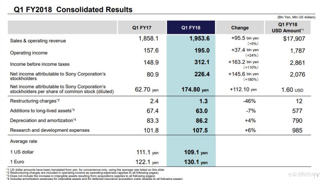 智通财经APP获悉,7月31日,索尼公布其2018财年首季财报。一季度,索尼公司实现营收1.9536万亿日元(约合175.8亿美元),同比增长5%;实现净利润2264亿日元(约合20.37亿美元),同比增长180%。