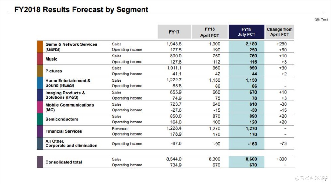 索尼对2018财年展望:销售1700万部PS4;营收8.6万亿日元(约合773.79亿美元), 较上年的8.544万亿日元增长4%;营业利润6700亿日元(约合60.28亿美元),较上年的7349亿日元下降9%;归属于索尼股东的净利润5000亿日元(约合44.99亿美元),较上年的4908亿日元增长4%。