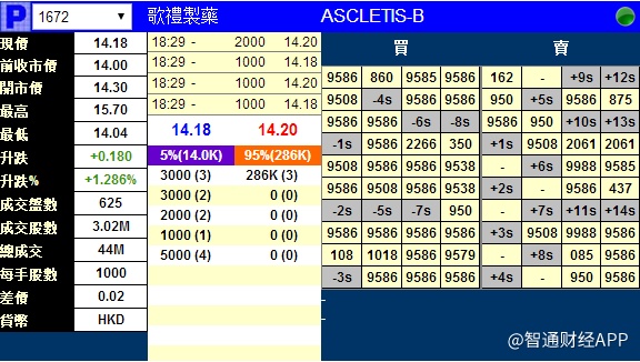智通财经APP获悉,香港首只未盈利生物科技企业新股歌礼制药-B(01672)将于下一交易日挂牌,上市前夕,据辉立交易场资料显示,歌礼制药-B暗盘开市报14.3元,较招股价14涨0.3元。收报14.18元,较招股价涨1.286%,每手1000股,不计手续费,每手赚180元。