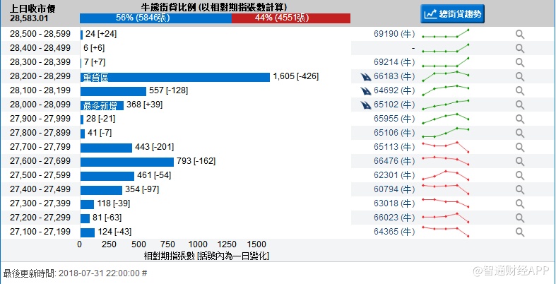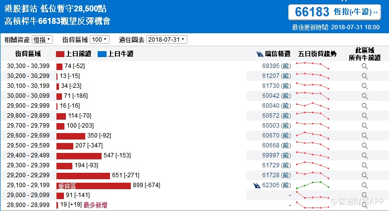智通财经APP获悉,截至8月1日,恒指最新的牛熊街货比例为56:44。从瑞信恒指牛熊证街货分布图中得到的数据显示,熊证街货重货区在29100-29199区间,此区间最新的熊证数量为899张,比上一交易日减少674张;最多新增区间在28900-28999,新增19张。牛证中重货区在28200-28299区间,该区间最新牛证数量为1605张,比上一交易日减少426张,最多新增落在28000-28099区间。