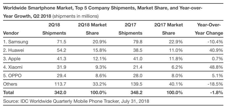 报告显示,苹果二季度市场份额从去年同期的12.1%降至11.8%,而华为的市场份额从去年同期的11%增至15.8%,成为仅次于三星电子的全球第二大智能手机厂商。三星电子二季度市场份额也出现萎缩,从去年同期的22.9%降至20.9%。
