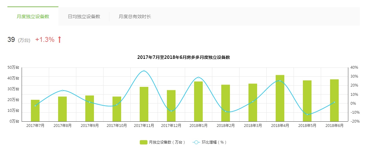 据艾瑞数据显示,从2017年7月-2018年6月这十二个月中,月独立设备数虽然总体呈增长趋势,但最高的月独立设备数也仅为43万台。而房天下在同期内平均月度独立设备数高逾400万台,差距不小。