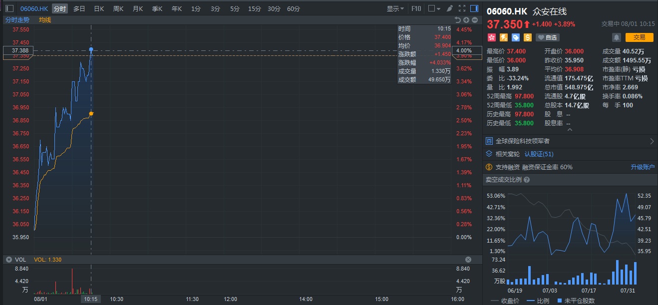 而受利好影响,截至发稿,众安在线涨幅超过4个点,成交额突破1500万港元。