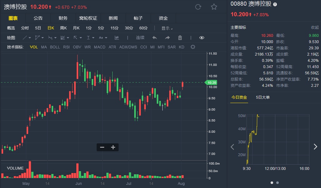 截至8月1日,澳博控股涨7.03%,报10.2港元。